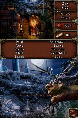 Welche Gegenstände es zu finden gilt wird im oberen Bildschirm angezeigt, die untere, berührungsintensive Fläche des DS ist dann die "Spielwiese". Um nicht auf das kleine Display des DS beschränkt zu sein sind die Hintergründe (im Gegensatz zu den PC-Suchbildspielen) scrollbar, wodurch sich das Suchen etwas schwieriger und fordernder gestaltet. Ein Hinweissystem gibt es hier natürlich, die Hilfe läd sich halt alle Nase lang wieder auf und man kann sich einen neuen Tipp geben lassen. Gelegentlich muss man Gegenstände nicht nur finden, sondern auch "benutzen", was sich aber oft als etwas an den Haaren herbeigezogen herausstellt.