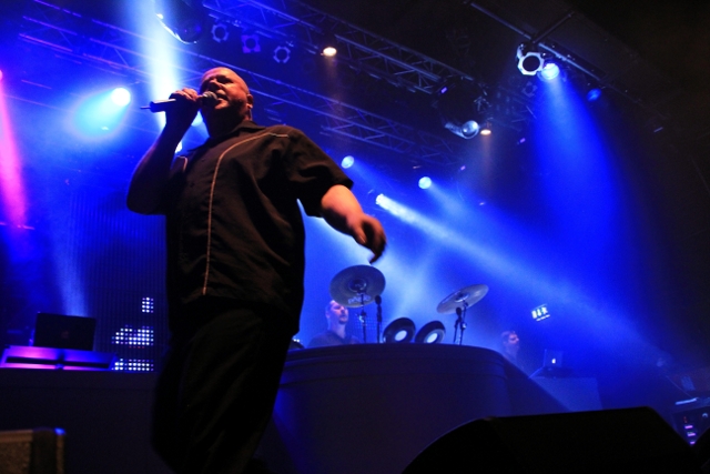 Während ich für die Fotos zuständig war, hat Bea mich unterstützt und die Setlist soweit möglich mitgeschrieben - Ich bin bei VNV Nation nämlich kein ausgewiesener Experte, wie ich zugeben muss. Los ging es aber in jedem Fall mit Retaliate, wobei die Lichttechniker bei diesem Song wohl vergessen hatten, den Schalter umzulegen... Oder war es Absicht, dass Ronan und Co fast im Dunkeln rumhüpften? Für uns Fotografen war das jedenfalls grauenhaft. Zum Glück hatten wir aber drei Songs Zeit um unsere Bilder zu ergattern, und ab Song zwei war die Beleuchtung dann auch gut genug, um ein paar anständige Fotos mitzunehmen.