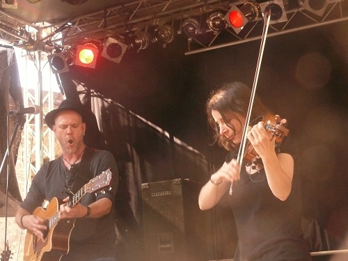 | Musik vom Feinsten präsentierten auch Bardic, ein Duo aus dem Ruhrgebiet, das in Sachen Acoustic Music spiced with Celtic Folk unübertroffen ist. Erneut konnte man Step it out Mary lauschen, diesmal aber in einer dem Text angemessenen zutiefst tragischen Interpretation, schließlich ertränkt sich die arme Mary in ihrer Not mit ihrem Geliebten im Fluß. Ein besonderes Highlight war sicherlich Bardics Coverversion des Hits Screamager der nordirischen Band Therapy? aus dem Jahre 1993, ganz zu schweigen von Sarah-Janes phänomenalem Geigensolo. Daneben wurde von der Großen Hungersnot in Irland (Irish Potato Famine), die aus der Geschichte der Grünen Insel nicht wegzudenken ist (war sie doch verantwortlich für das Auswandern etlicher Iren in die USA und den Rest der Welt) erzählt; Bardic sind der lebende Beweis, dass Gitarre, Geige und zwei Stimmen völlig reichen um richtig gute Musik zu machen.
