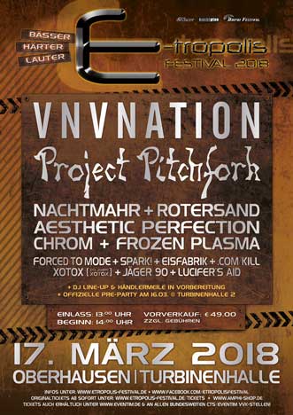 Unter dem Motto "Bässer - Härter - Lauter" findet jährlich das E-Tropolis-Festival statt und bietet seit jeher einen Querschnitt aus großartigen Gothic-Electro, Industrial und EBM-Acts. Auch in diesem Jahr hat man sich nicht lumpen lassen, als Headliner ist niemand geringeres als VNV Nation am Start. Unterstützt wird die Band um Mastermind Ronan Harris von großartigen Kollegen wie i>Project Pitchfork ai>Rotersand, Eisfabrik und Frozen Plasma. Das gesamte Line Up findet Ihr im folgenden: