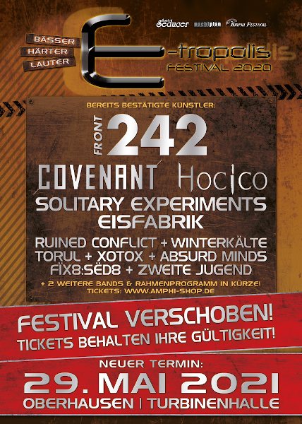 Bis auf Grendel und Diorama - die ihre Verfügbarkeit noch klären müssen - haben auch schon alle anderen Bands des 2020er Line-Ups diesen neuen Termin bestätigt. Bereits gekaufte Tickets für das E-tropolis Festival 2020 behalten ihre Gültigkeit für den 29.05.2021. Wir - sowie alle Bands und Dienstleister des Festivals - würden uns sehr freuen, wenn ihr eure Tickets für den neuen Termin behaltet. Falls ihr den neuen Festivaltermin nicht wahrnehmen könnt, könnt ihr euch ab dem 01.06. per E-mail an die Adresse tickets@etropolis-festival.de wenden.
