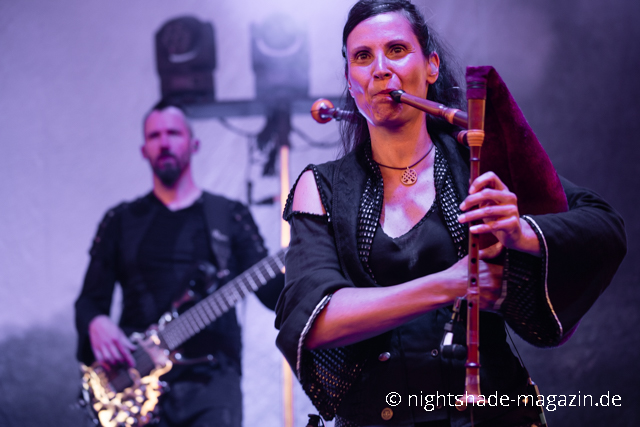 Nightshade Logo: Ein feenartuiges Wesen mit Flügeln,d as eine Flöte spielt