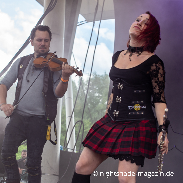Nightshade Logo: Ein feenartuiges Wesen mit Flügeln,d as eine Flöte spielt